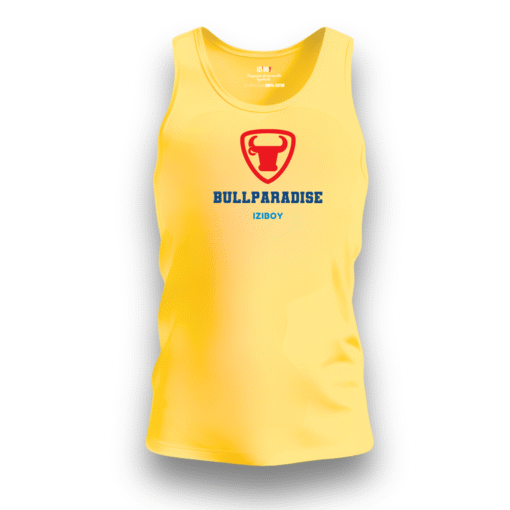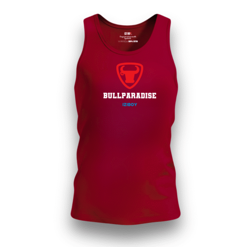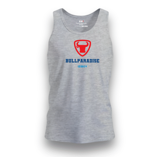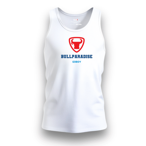 Débardeur BullParadise en jersey 100% coton 140g/m². Écusson taureau rouge, marquage BULLPARADISE blanc et logo iziboy bleu ciel. Message positif caché à l’intérieur. Coupe régulière, sans étiquette. 6 coloris disponibles, tailles S à 2XL.