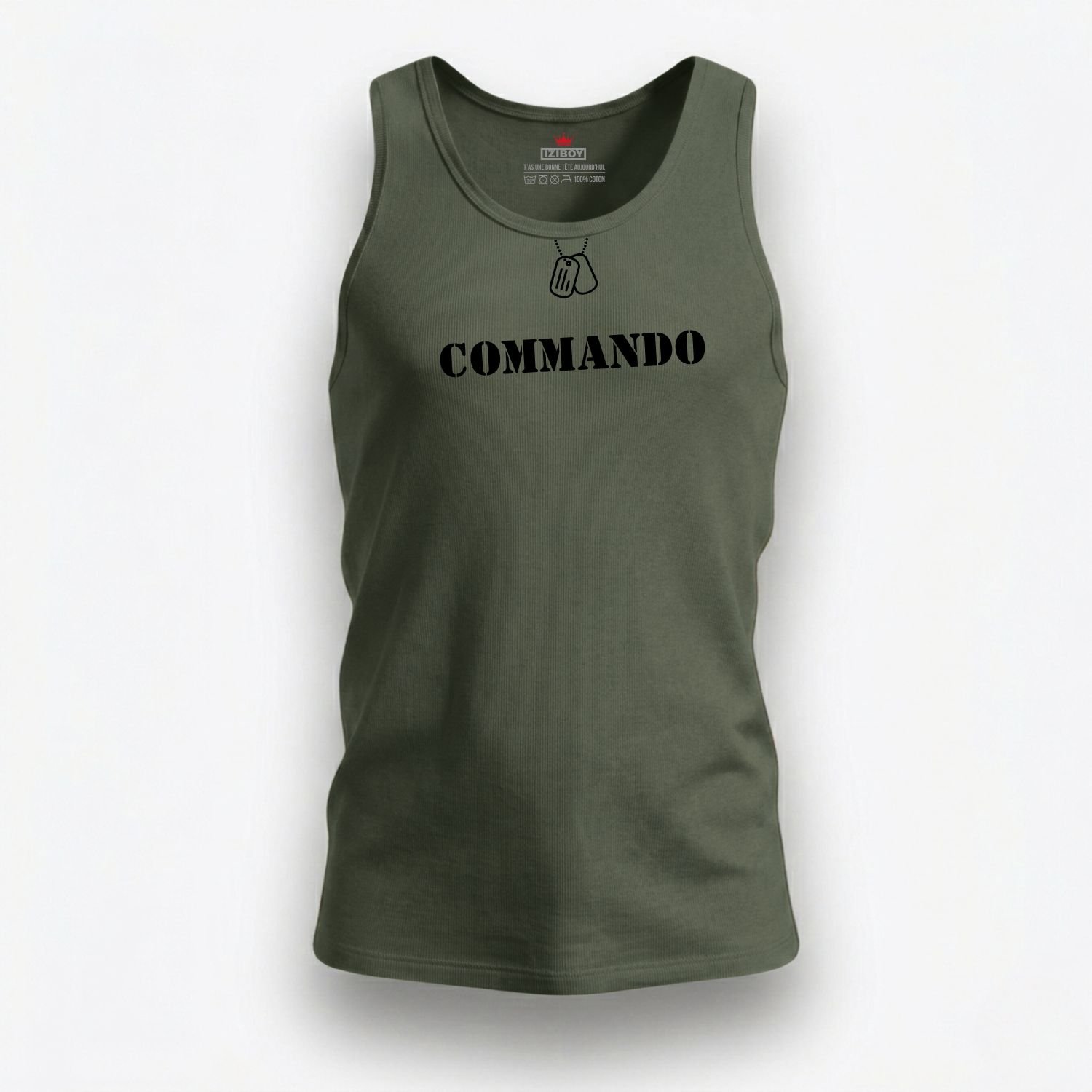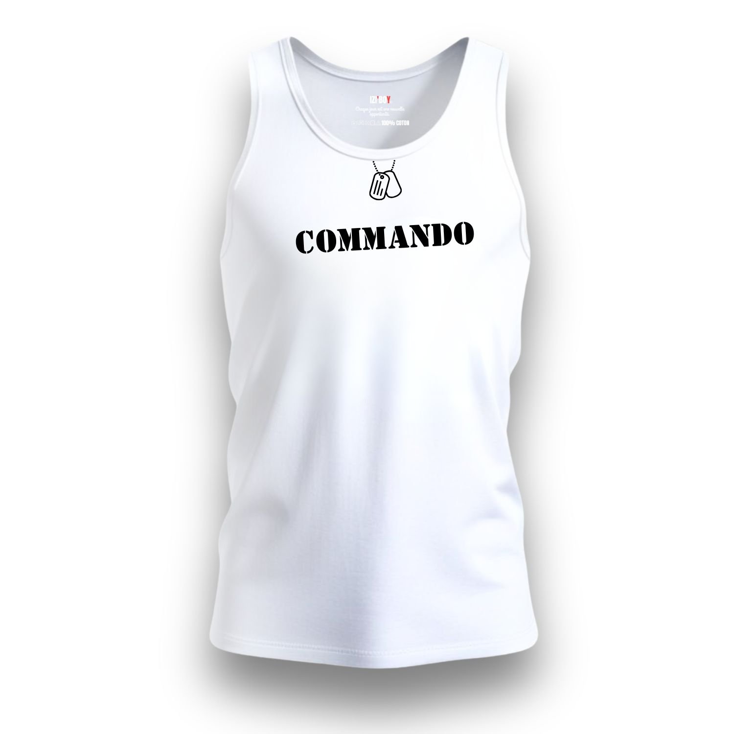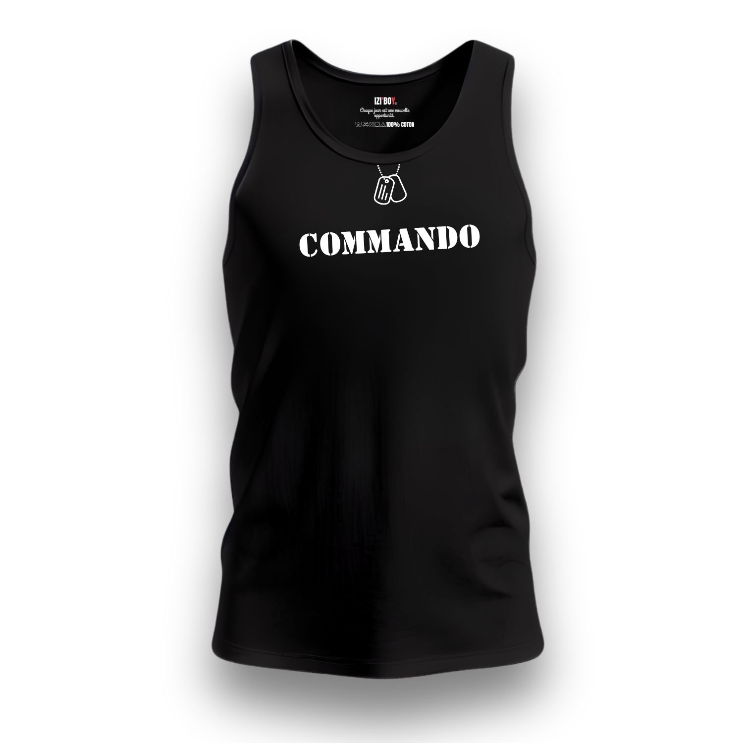 Le design du débardeur Commando attire immédiatement le regard par ses détails précis. Premièrement, une illustration noire de plaques d’identité avec leur chaînette orne le col. Ce motif rappelle les valeurs de courage et de fraternité des unités spéciales. Deuxièmement, l’inscription “commando” s’affiche en grand et en noir sur la poitrine. Ce marquage puissant affirme votre détermination dès le premier regard. Enfin, une signature technique décore le haut du dos, juste sous le cou. Elle précise les mentions : “TYPE : ATHLETIC UNIT – MODEL : IZIBOY-V1 – ORIGINE : FR”. Ces éléments transforment ce débardeur en une véritable pièce d’équipement moderne.
