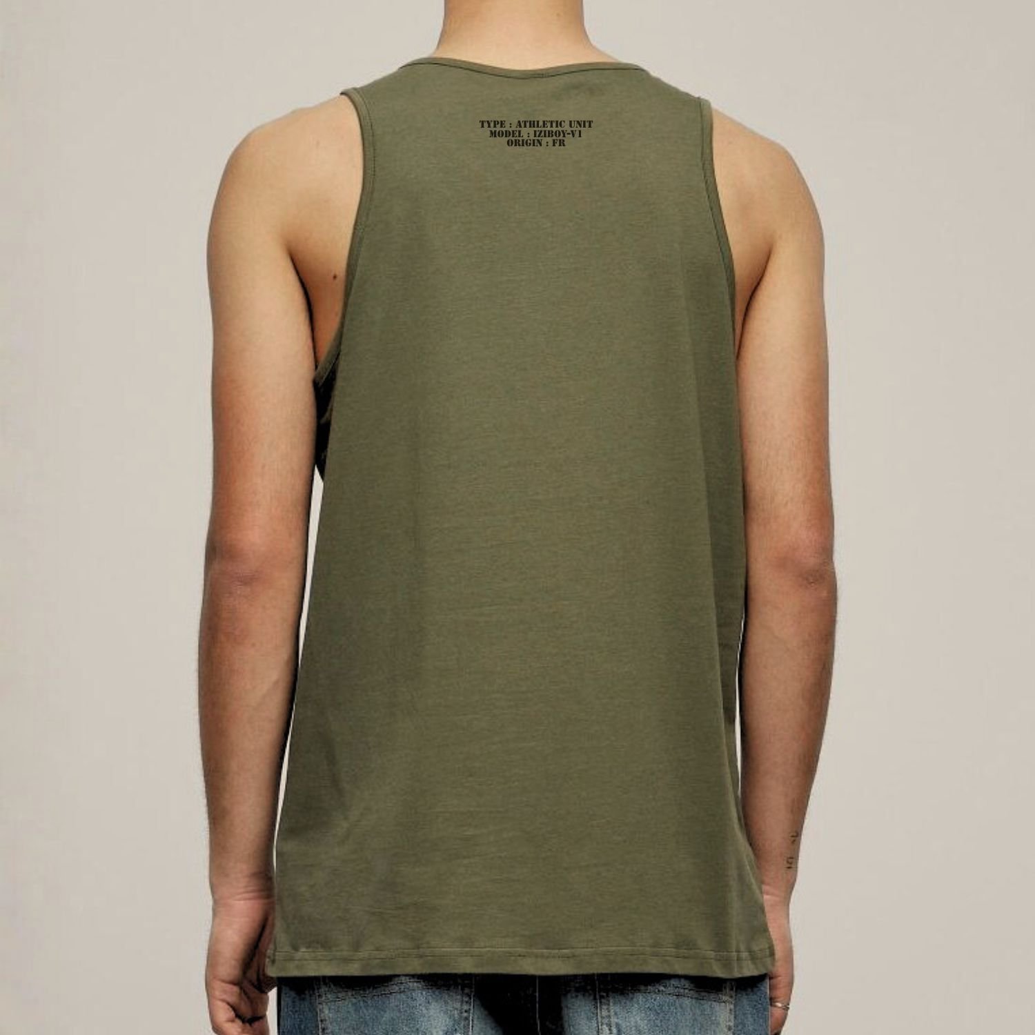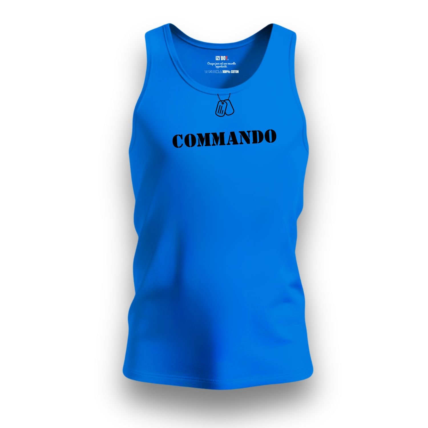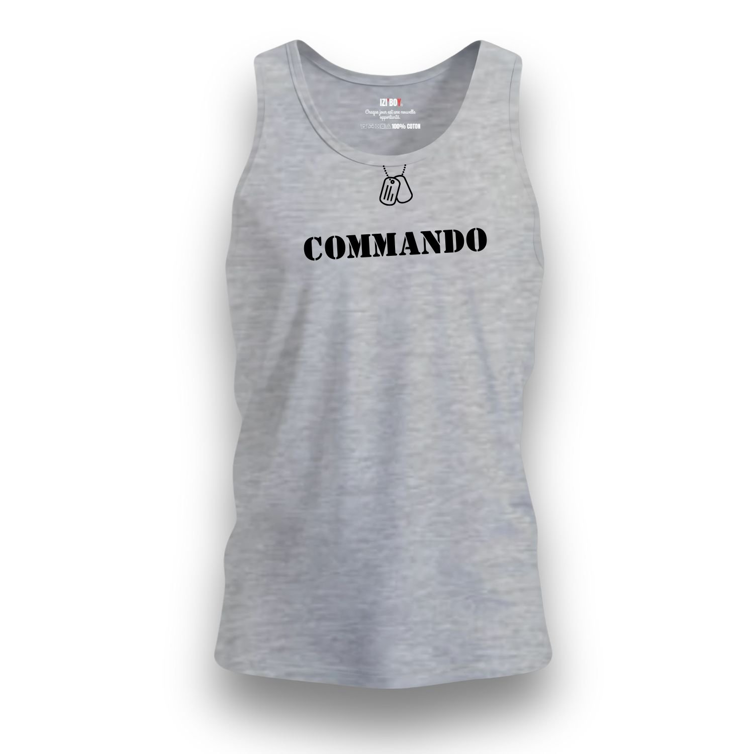 Le design du débardeur Commando attire immédiatement le regard par ses détails précis. Premièrement, une illustration noire de plaques d’identité avec leur chaînette orne le col. Ce motif rappelle les valeurs de courage et de fraternité des unités spéciales. Deuxièmement, l’inscription “commando” s’affiche en grand et en noir sur la poitrine. Ce marquage puissant affirme votre détermination dès le premier regard. Enfin, une signature technique décore le haut du dos, juste sous le cou. Elle précise les mentions : “TYPE : ATHLETIC UNIT – MODEL : IZIBOY-V1 – ORIGINE : FR”. Ces éléments transforment ce débardeur en une véritable pièce d’équipement moderne.