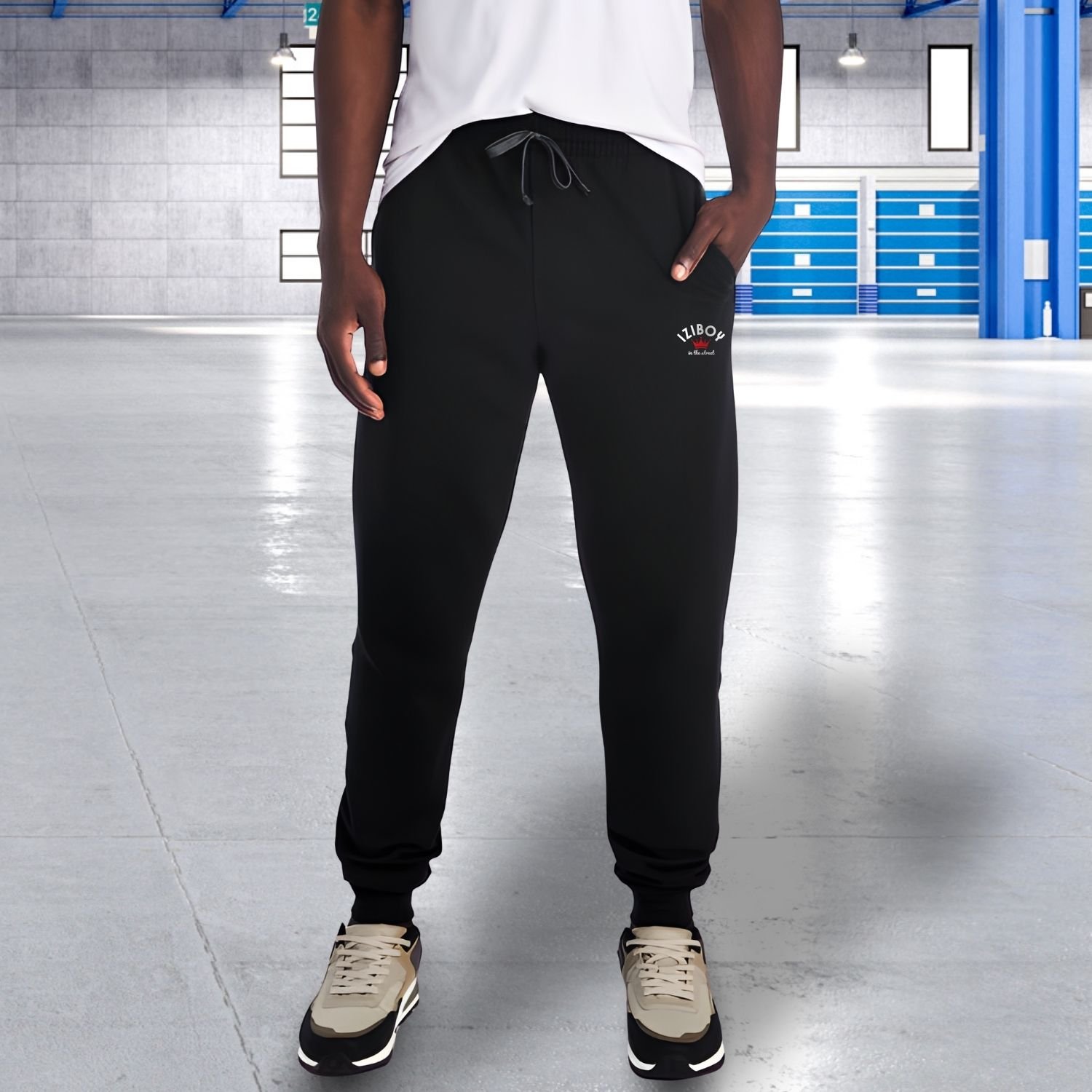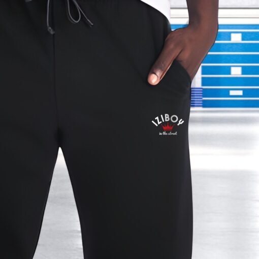 Jogging noir In The Street avec logo iziboy et couronne rouge. Coupe moderne, bas de jambes côtelés, confort et qualité durable.