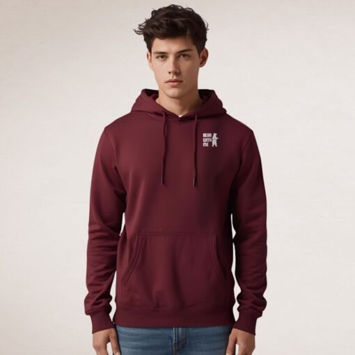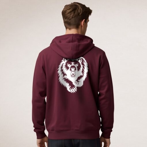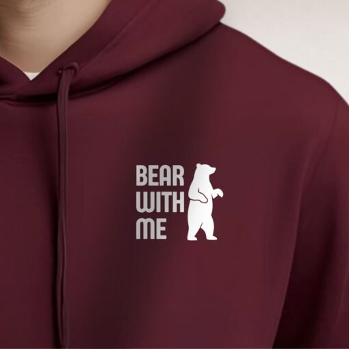 Le sweat à capuche Bear With Me affiche un ours féroce en monochrome blanc. Confortable et résistant, il combine style affirmé et message positif caché à l’intérieur. Disponible en bordeaux, bleu ciel et gris, du S au 2XL.