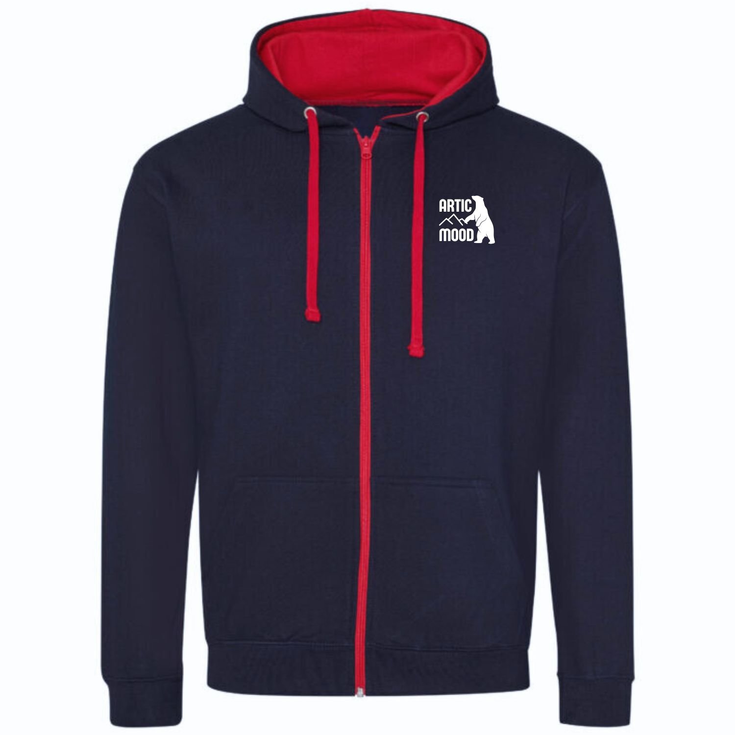 Ensuite, le sweat zippé “Artic Mood” affirme son style grâce à ses détails contrastés rouges. La fermeture éclair YKK rouge ajoute une touche vive au bleu marine profond. Le cordon plat rouge et la capuche doublée rouge créent un équilibre entre sobriété et dynamisme.