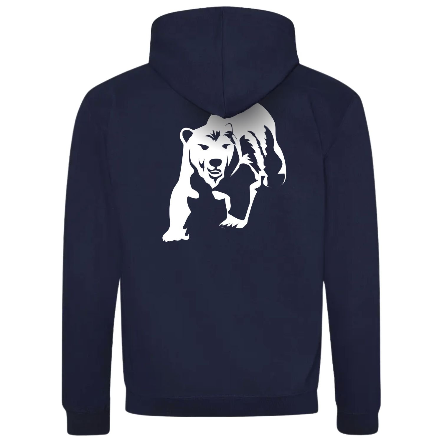 Dans le dos, un grand ours en entier impose sa présence. Ce dessin monochrome blanc contraste avec le bleu profond du tissu et crée un effet visuel fort. Le message est clair : avancer avec calme, mais ne jamais reculer. Ce design sobre, presque méditatif, transforme le sweat en véritable manifeste de force intérieure.