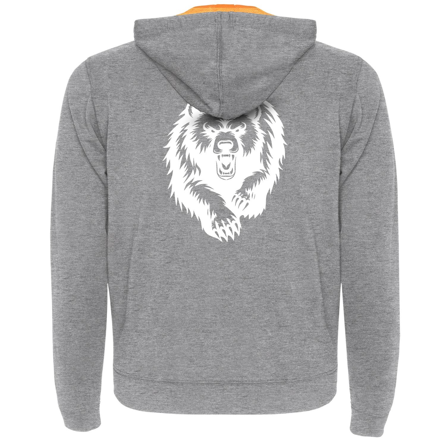 Sweat zippé gris moucheté avec touches orange fluo. Devant : inscription “Bear with me” et silhouette ours blanc. Dos : grande silhouette d’ours blanc. Coupe confortable, coton majoritaire, finitions soignées.