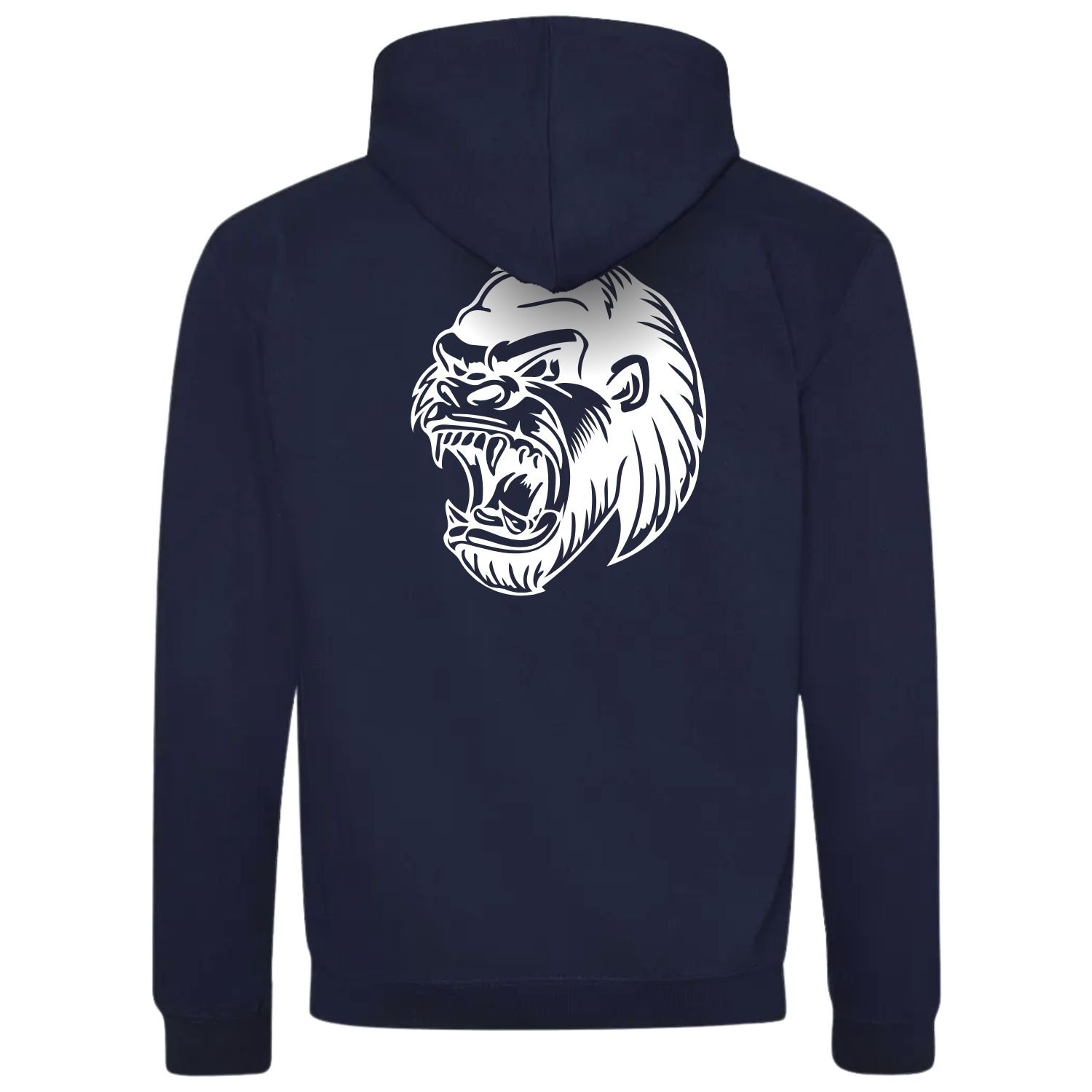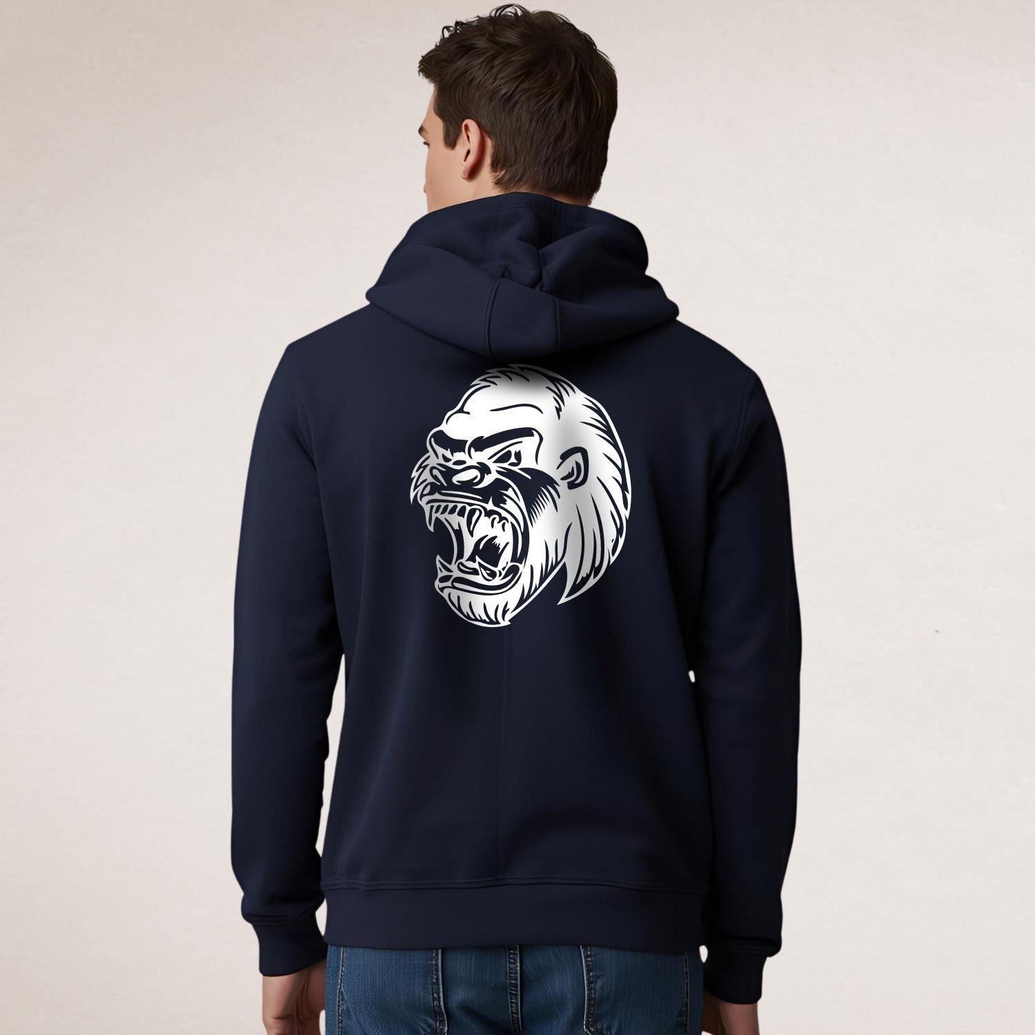 Au dos, une grande tête de gorille agressive attire immédiatement l’attention. Les traits monochromes blancs accentuent la tension du regard et la puissance du dessin. Chaque ligne reflète la rage contenue, la force prête à jaillir. Le contraste du motif avec le fond bleu marine crée un impact visuel fort et instantané.