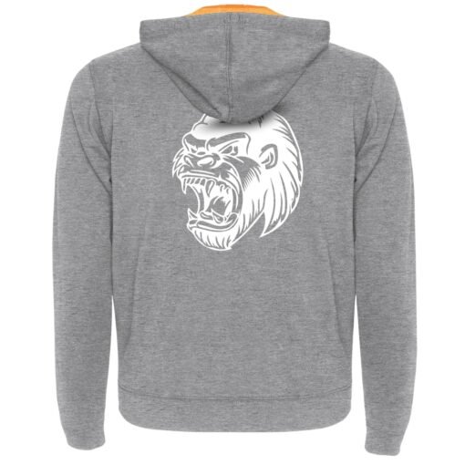 Sweat zippé gris moucheté avec détails fluorescents. Devant : “Primal Power” avec silhouette de gorille. Dos : tête de gorille agressive en blanc.