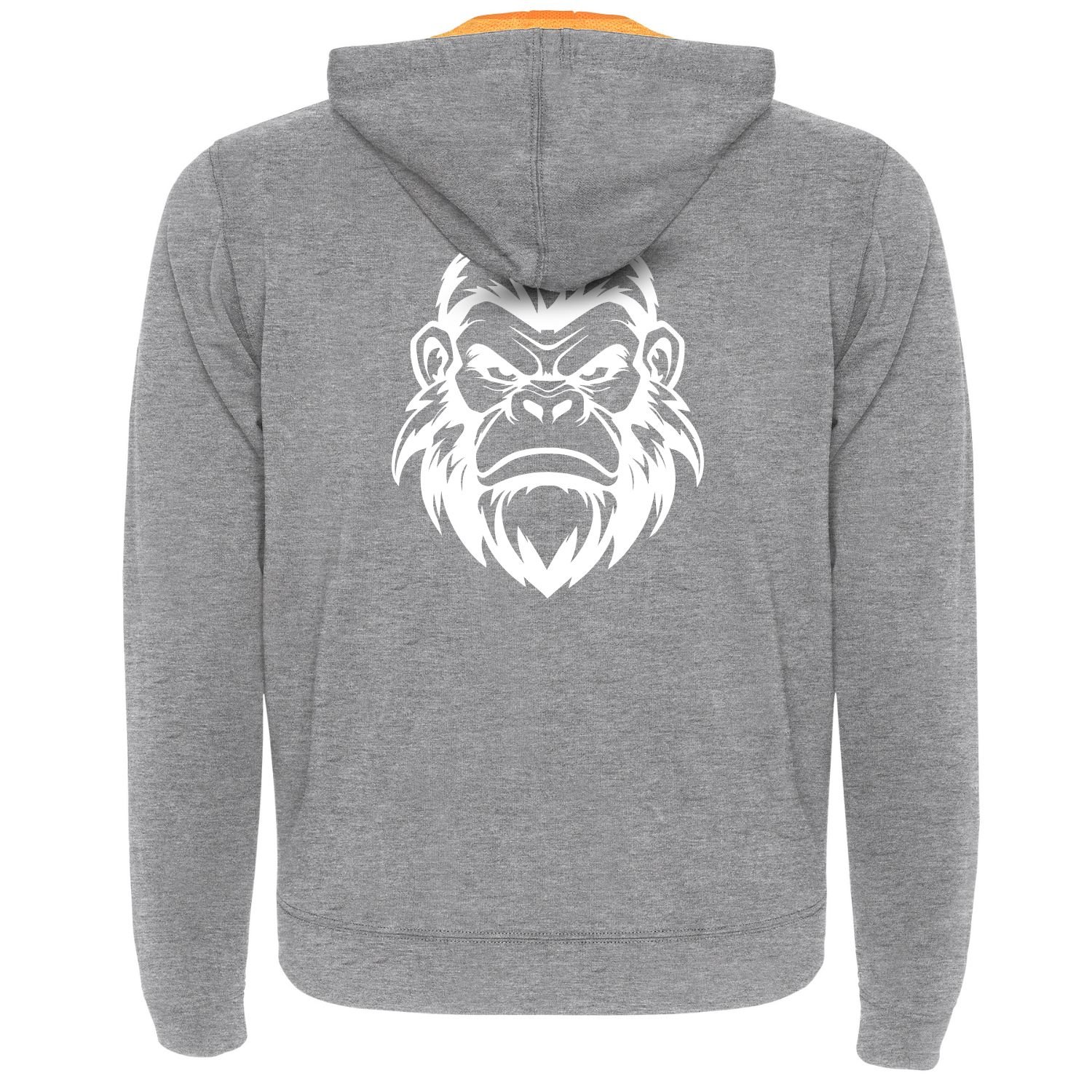 Sweat zippé gris moucheté à touches fluo. Devant : inscription “Wild instinct” et silhouette gorille blanc. Dos : grand visage de gorille en blanc. Confort, style et finitions soignées.