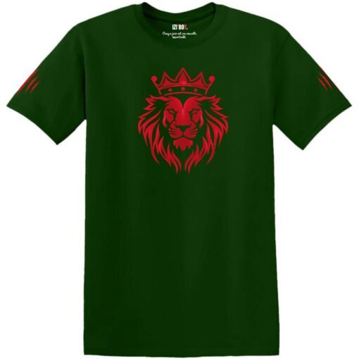 Le motif principal du t-shirt “Lion Majestueux” capte immédiatement l’attention. Une tête de lion couronnée s’impose avec son allure souveraine. La couronne souligne la grandeur et l’autorité de l’animal. Tandis que sa gueule ouverte inspire à la fois respect et puissance. Le choix du rouge métallisé pour ce design accentue le caractère majestueux du lion tout en apportant une touche de modernité et d’originalité.