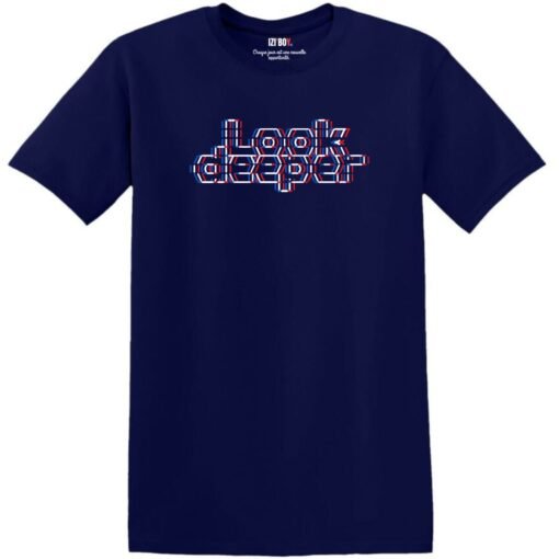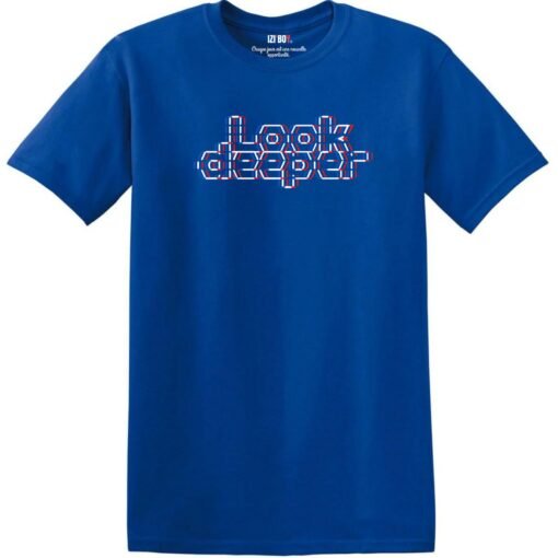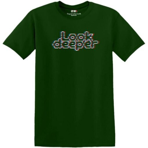 Ensuite, le motif “Look Deeper”, réalisé dans l’ancien style 3D, est un hommage au design rétro. Mais avec une touche de modernité. Les couleurs bleu, rouge et blanc, superposées pour créer cet effet de profondeur. Elles donnent à ce t-shirt un aspect unique et accrocheur. Ce n’est pas seulement un t-shirt pour les nostalgiques des années 80. Mais pour tous ceux qui aiment porter des vêtements avec un sens et un style distinct. Ce motif rappelle aussi l’idée que certaines choses ne se dévoilent qu’à ceux qui prennent le temps de les voir.